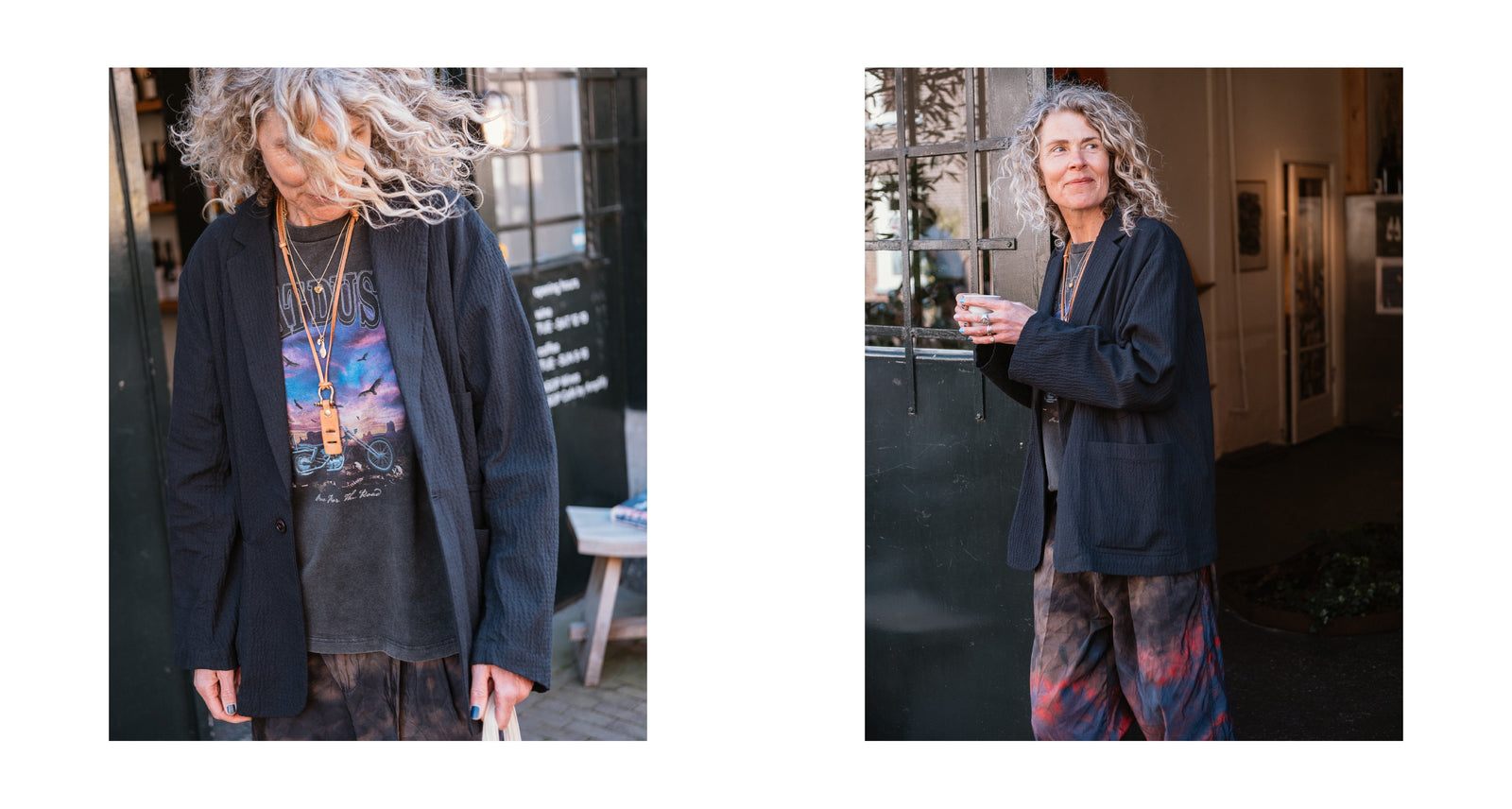 Marieke on her part, chose to wear the Ambassador Pants in the seasonal exclusive Tie Dye Nylon version. She's combining it with our Digger Tee and this season's bestselling Blazer in sahara cotton.