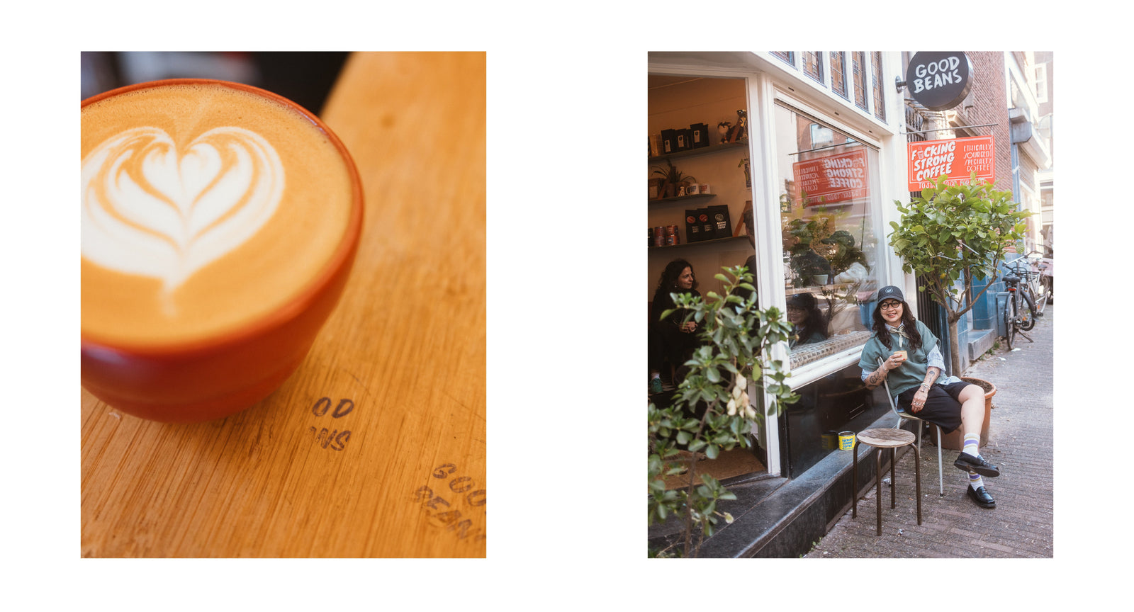 Good Beans is a cosy neighbourhood spot for delicious coffee and speciality beans tucked just off the bustling Haarlemmerdijk, known for its vibrant community of regulars, friendly service, and cheeky inhouse brand, aptly named Fucking Strong Coffee.