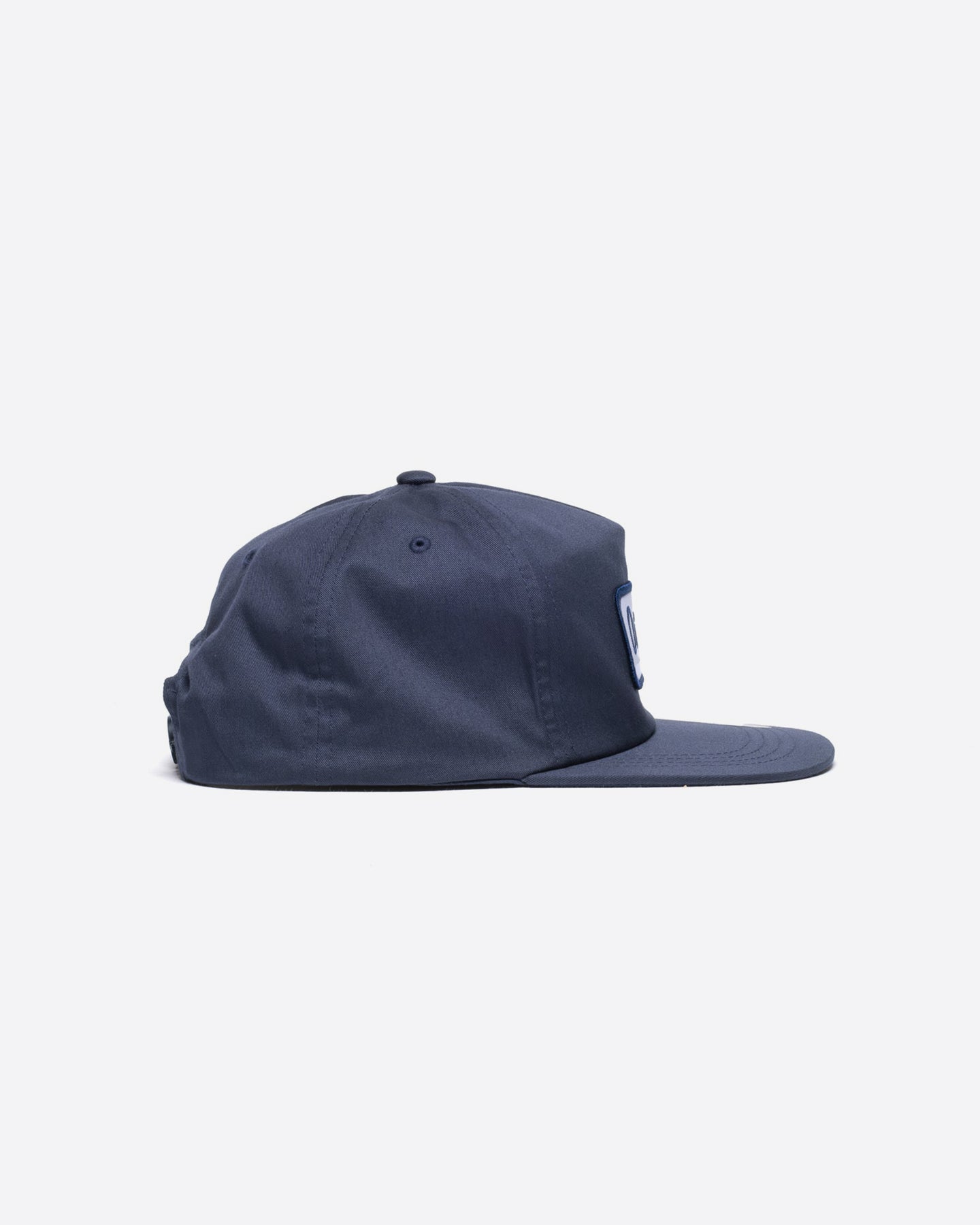 Lightweight classic snapback in navy, with a crushable unstructured upper and vintage gas station type of vibe. Features the ED673 logo as a front patch.