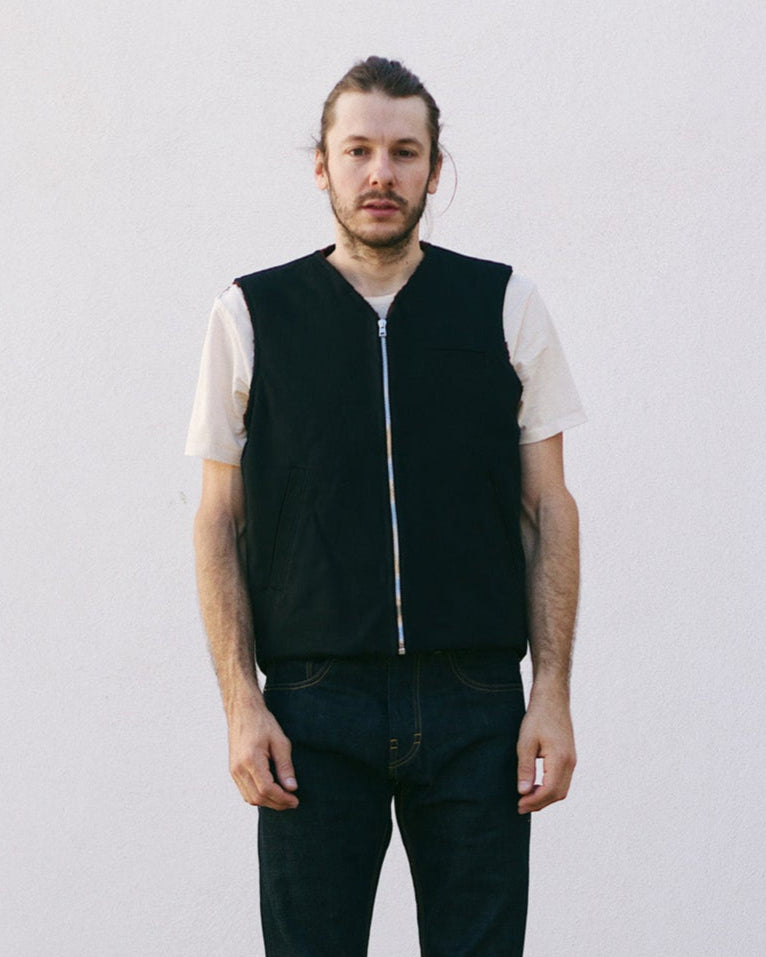Sleeveless deck vest that comes in black 100% cotton Bedford Cords from our Belgian mill, featuring 2 slash hip pockets (lined with a wool blend) and a chest pocket. The body was lined with wool, also has an interior pocket.