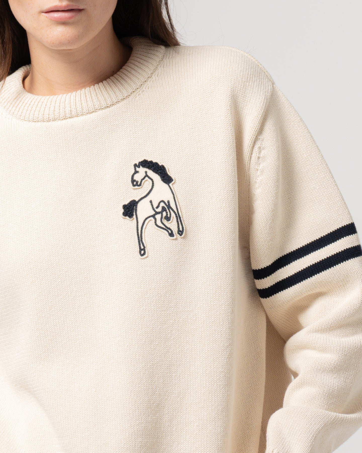 Our League sweater is a knitted cotton jumper featuring a clean, modern silhouette with a subtle horse patch detail. Designed as a new style for the Spring Summer 2026 season, it has a cropped fit for an effortless, contemporary look.