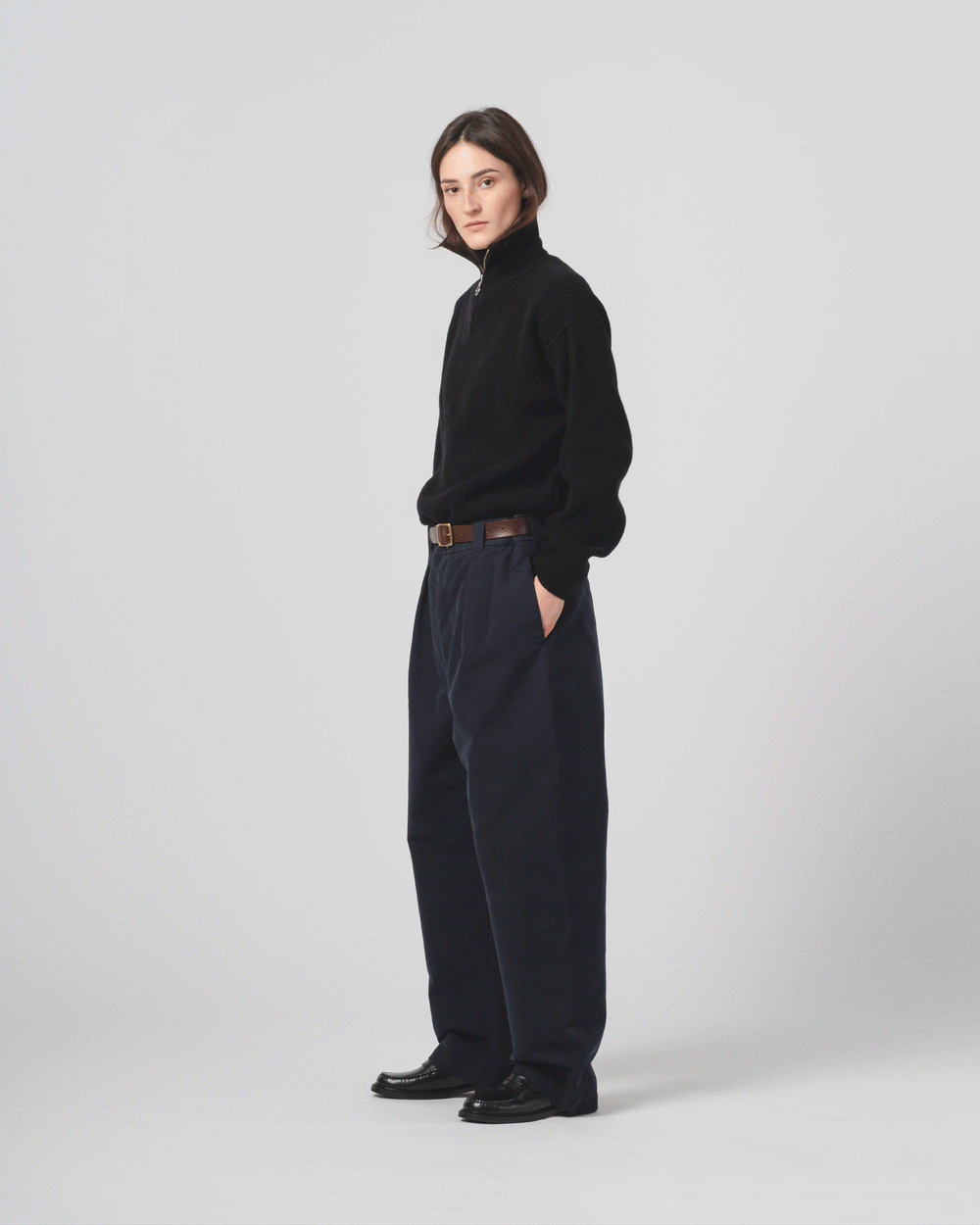 当店で最も人気のある商品のひとつ。ゆったりとした着心地を好む方のために作られました。ハイウエスト、脚に沿って緩やかにテーパードしたルーズなシルエットで、ダブルプリーツのフロントによりさらにボリューム感があります。まさに、リラックスした時間を過ごすためにデザインされたパンツです。