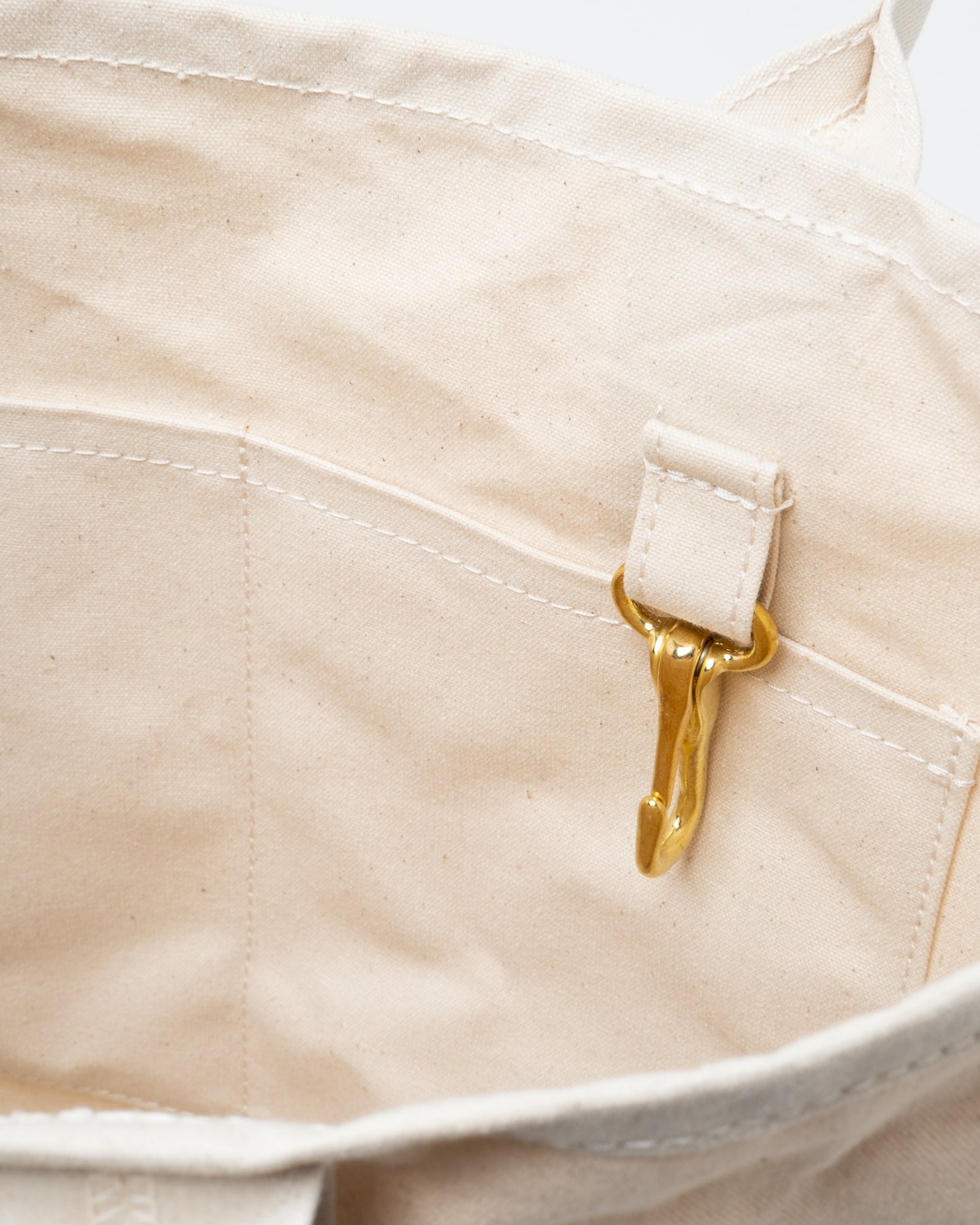 The smaller version of our heavy duty shopper. Can also easily be your go-to-work bag, your hit-the-beach bag, your pic nic bag, your grocery shopping bag - 'cause it's that versatile and sturdy. Made from a heavy duty Italian cotton canvas, finished with simple handles and subtle branding. Also features 2 vertical loops on one side, 1 horizontal loop on the other, 2 interior pockets and an interior brass hook. Built to last.