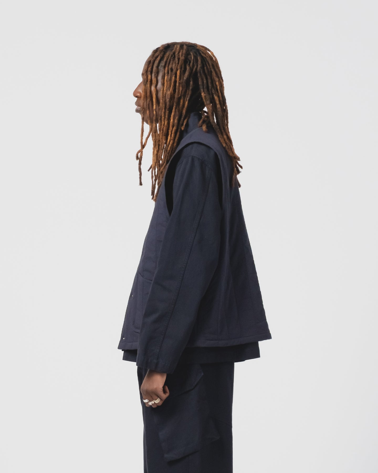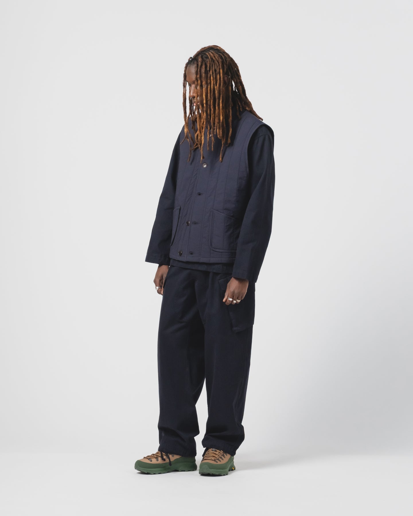 バッテリーベストの冬仕様にアップグレードしたモデル。100%コットンキルティング生地を使用。フロントのボタン留めと斜めになったサイドポケットが特徴で、レイヤリングスタイルをワンランクアップさせるのに最適なアイテムです。