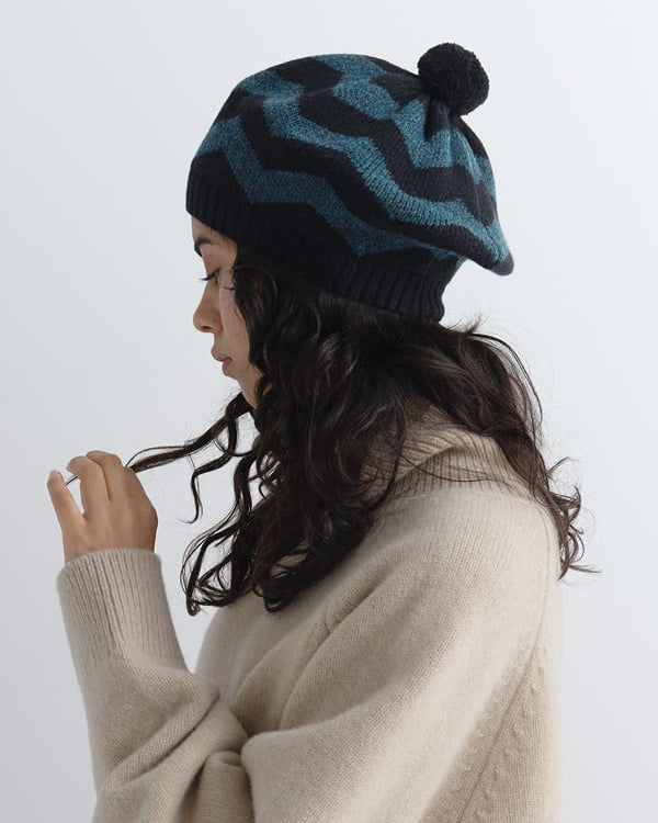 伝統的なスコットランドのタム・オ・シャンター帽をアレンジした当店のオリジナル帽子。ベレー帽のようにかぶったり、ボブル帽のように耳まで覆うようにかぶったりできます。全体に大胆なジグザグ模様が施されています。