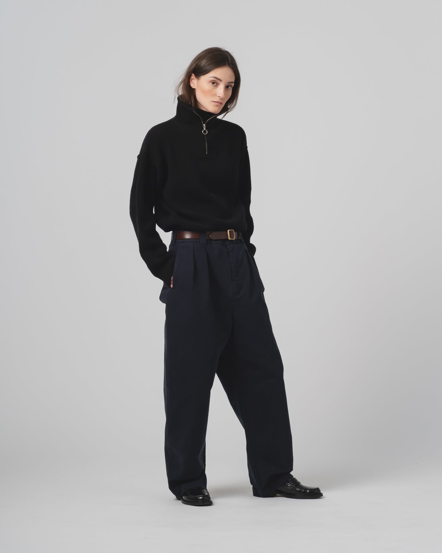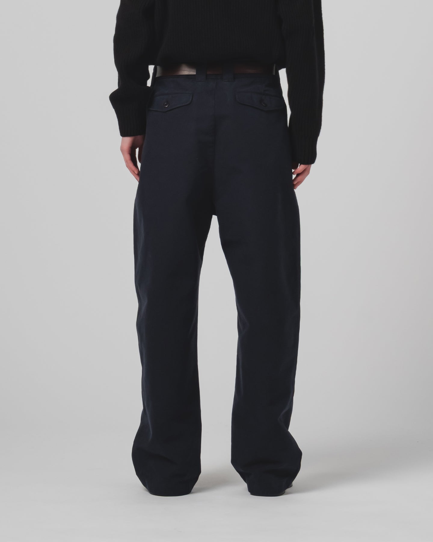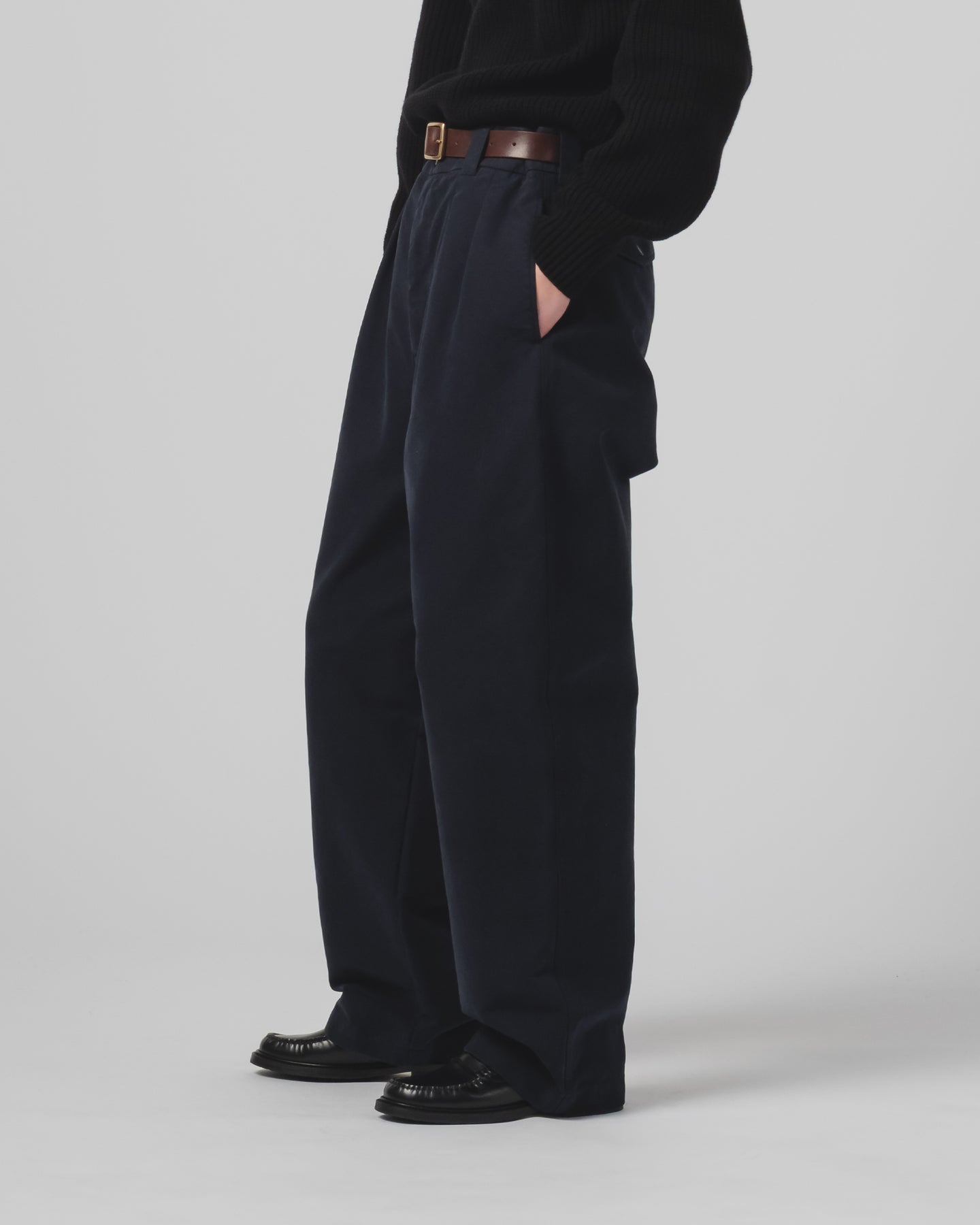 当店で最も人気のある商品のひとつ。ゆったりとした着心地を好む方のために作られました。ハイウエスト、脚に沿って緩やかにテーパードしたルーズなシルエットで、ダブルプリーツのフロントによりさらにボリューム感があります。まさに、リラックスした時間を過ごすためにデザインされたパンツです。