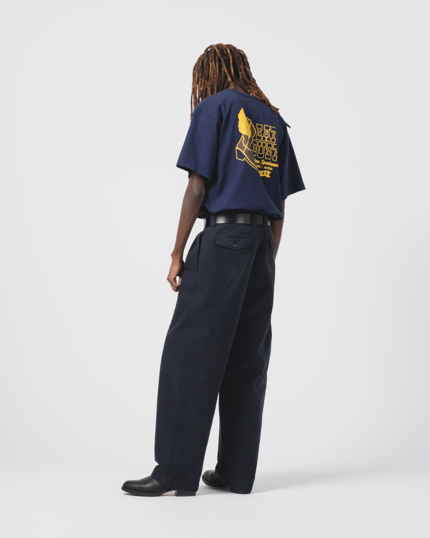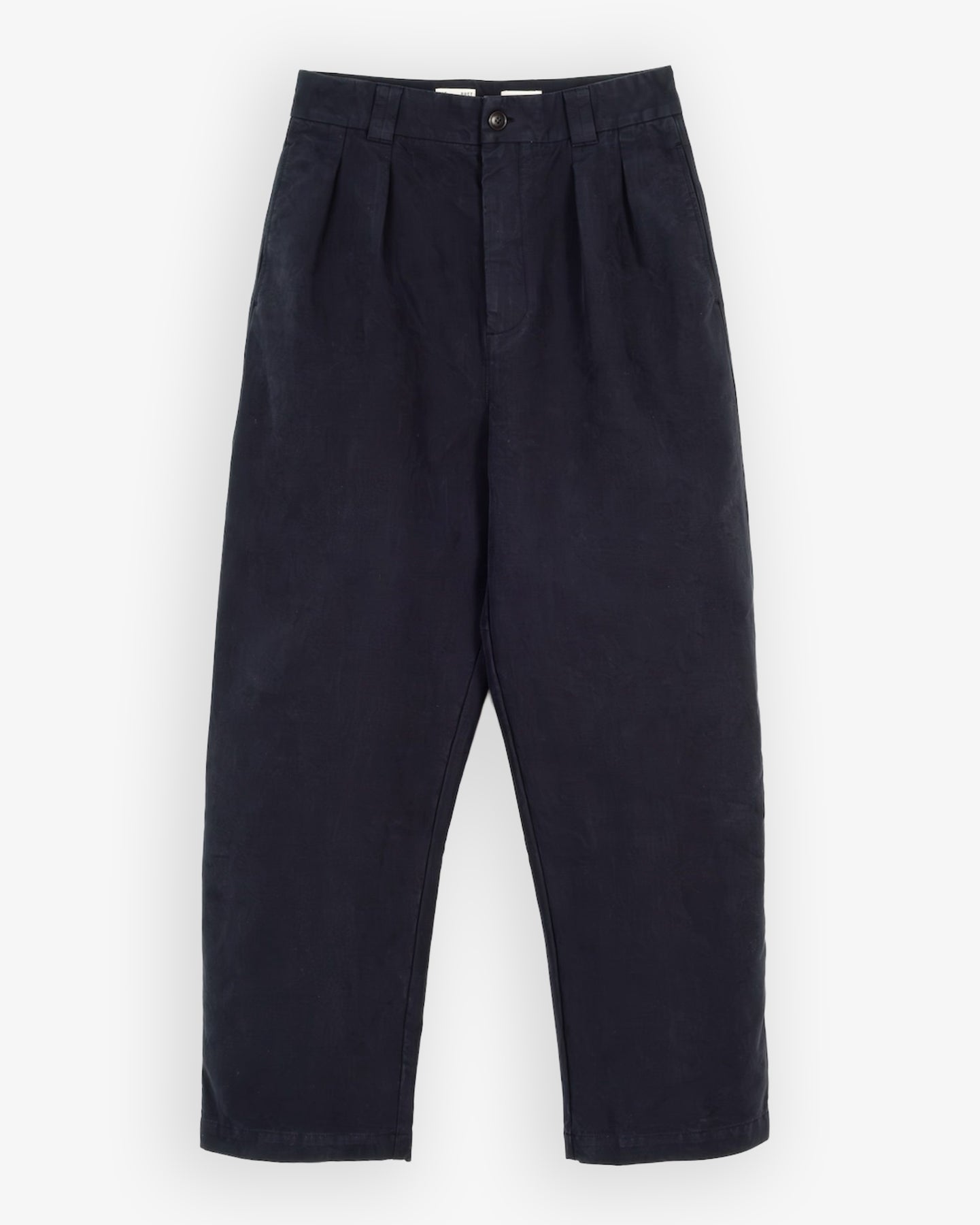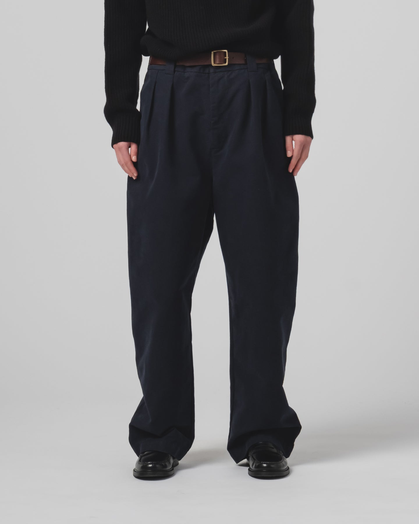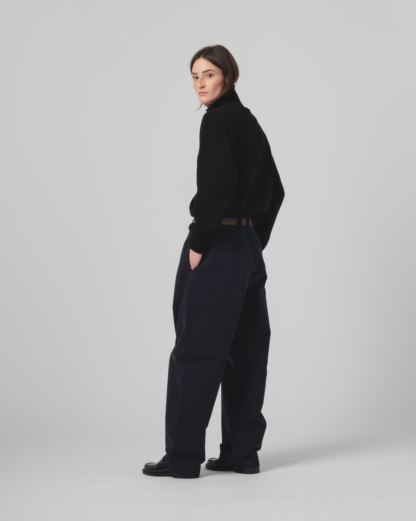 当店で最も人気のある商品のひとつ。ゆったりとした着心地を好む方のために作られました。ハイウエスト、脚に沿って緩やかにテーパードしたルーズなシルエットで、ダブルプリーツのフロントによりさらにボリューム感があります。まさに、リラックスした時間を過ごすためにデザインされたパンツです。