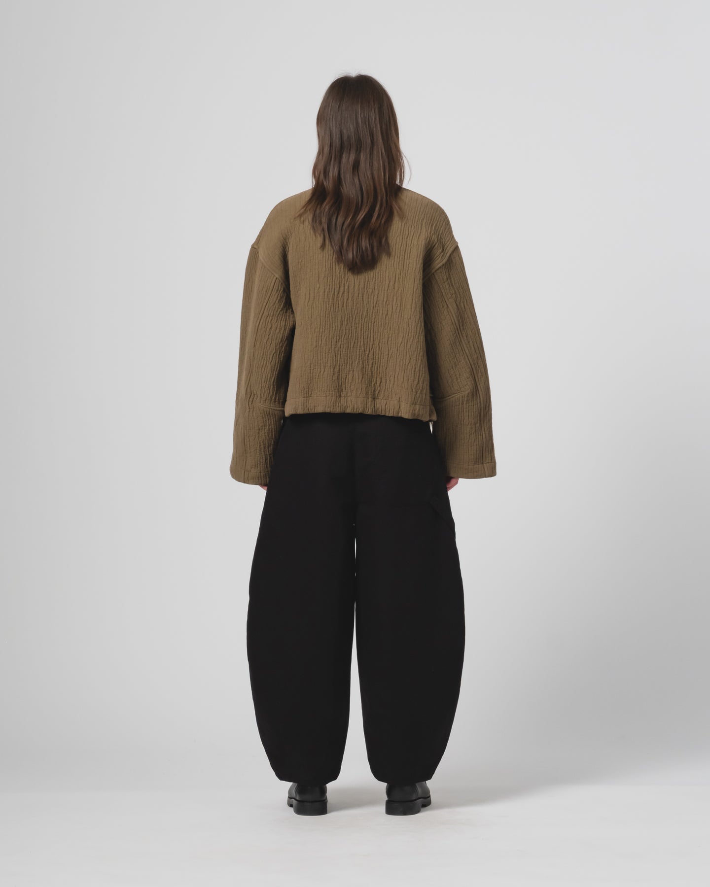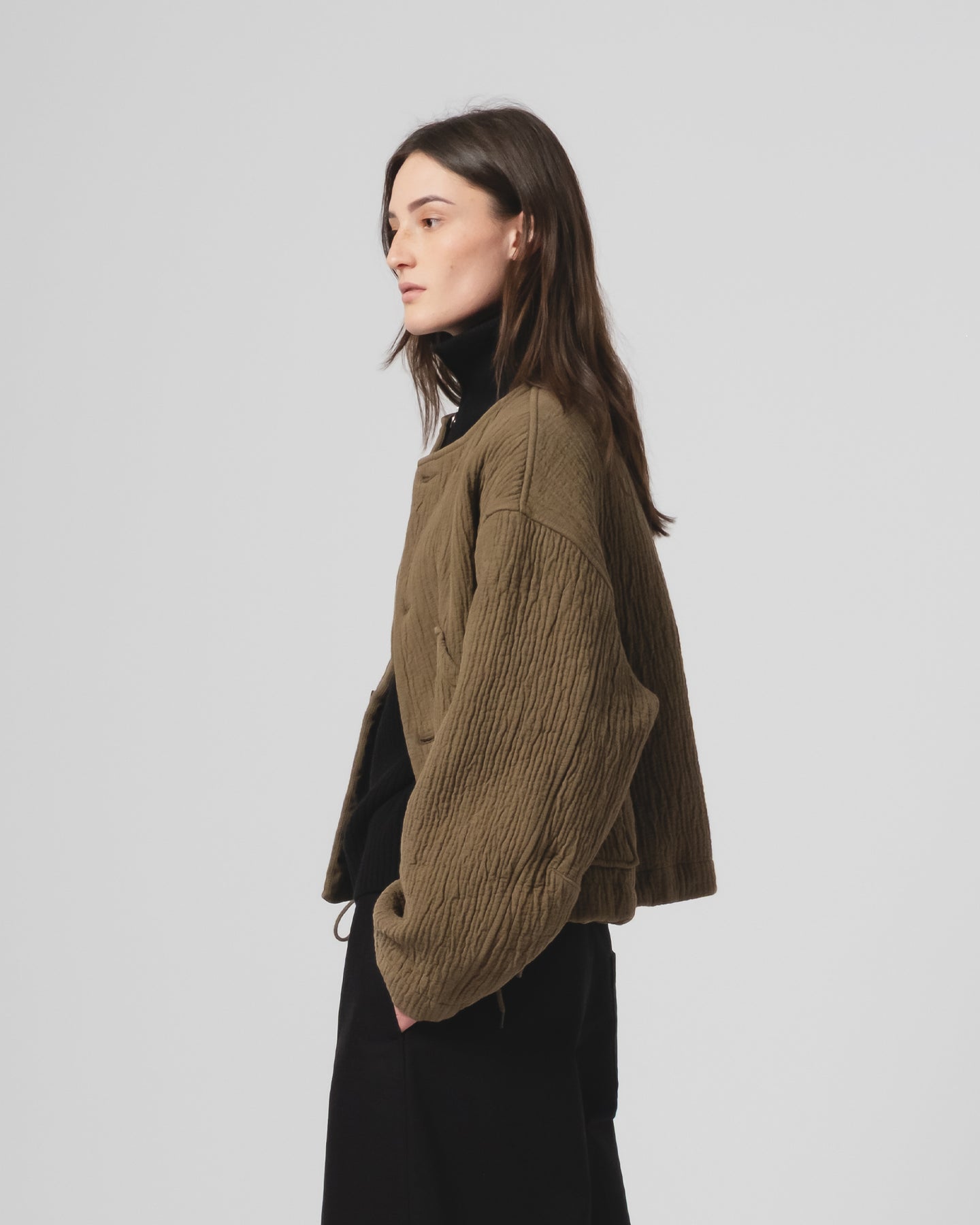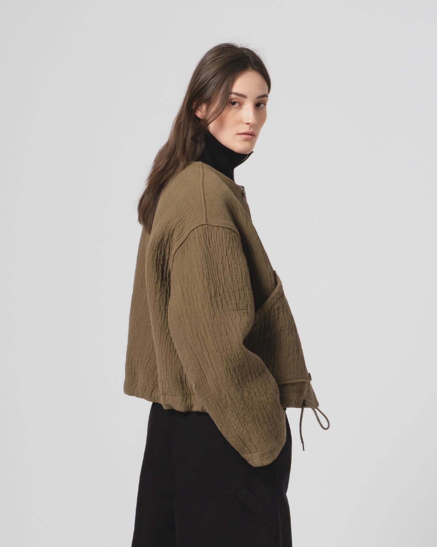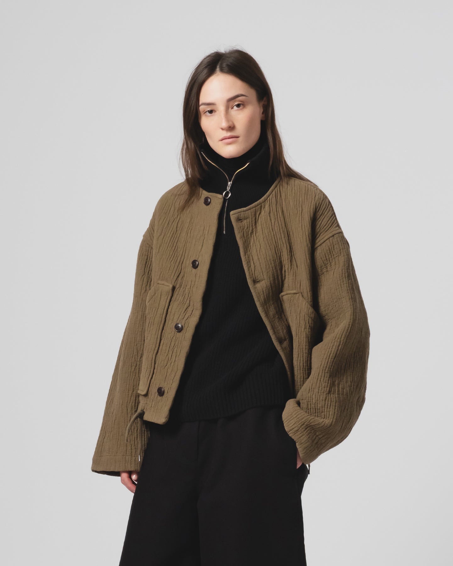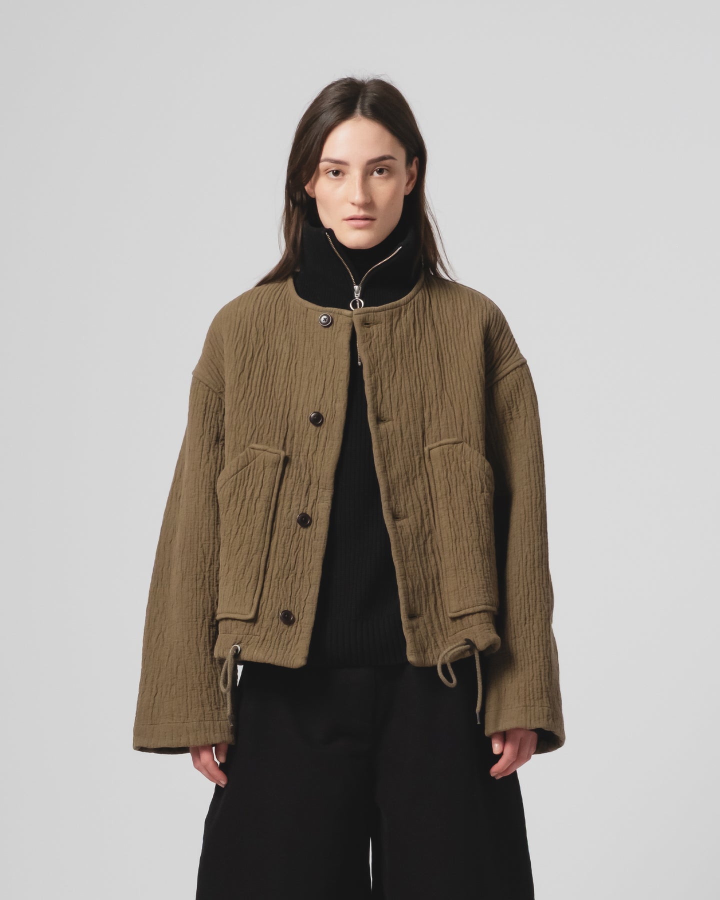 ビンテージのミリタリージャケットをベースにした当社のニュークリアジャケットは、ゆったりとしたボックスシルエットです。気取らないスタイルで、ラフに着こなすのがおすすめです。2つの大きなフロントポケット、コローゾボタン、裾のドローストリングが特徴です。