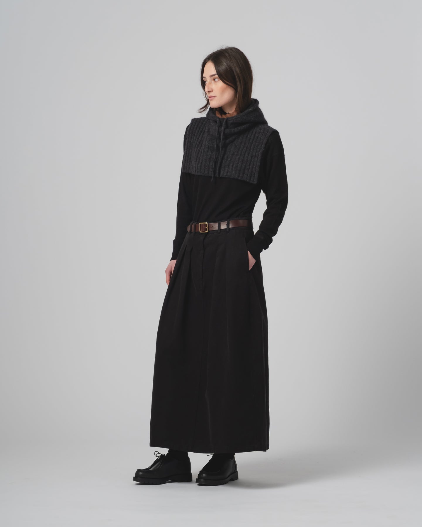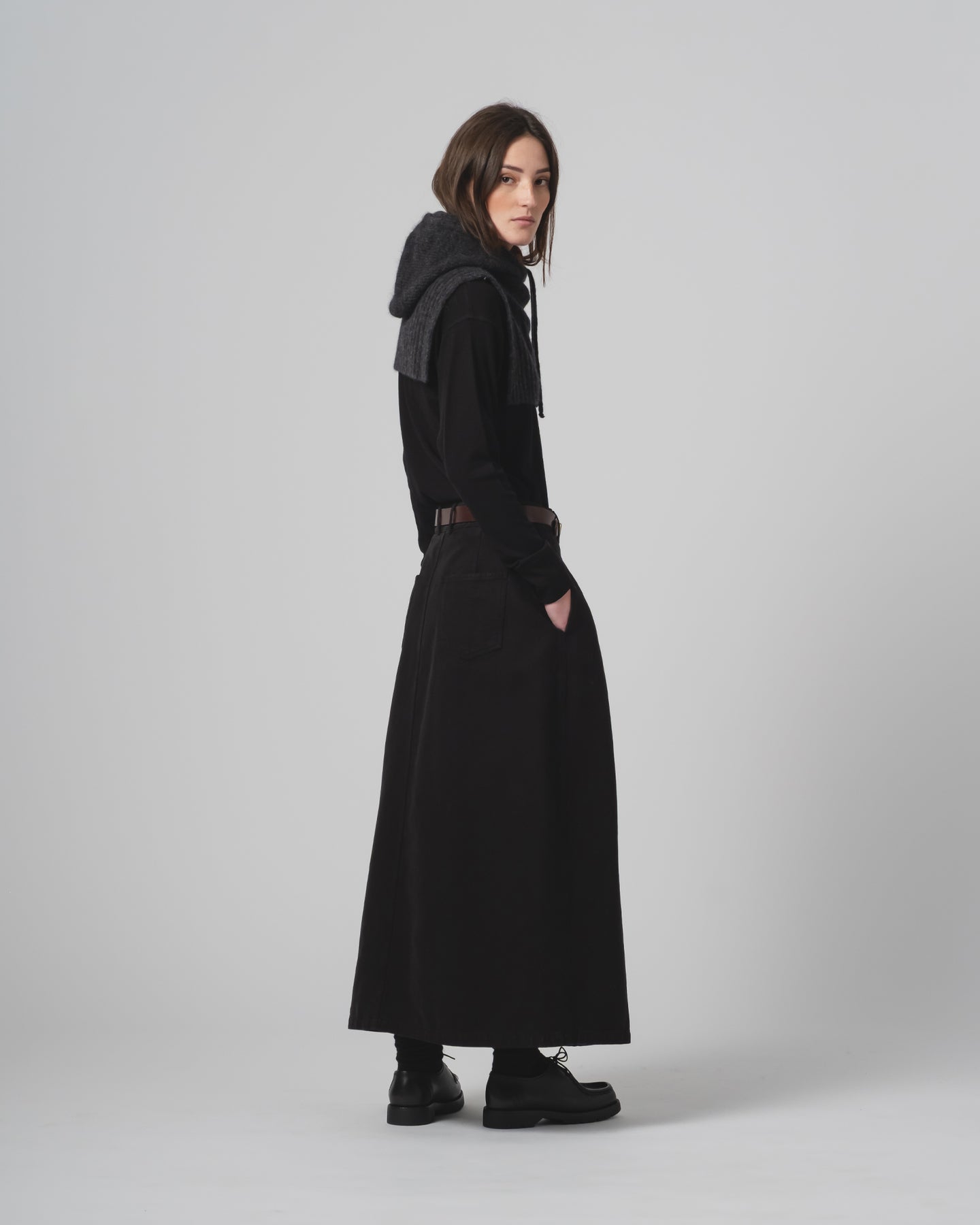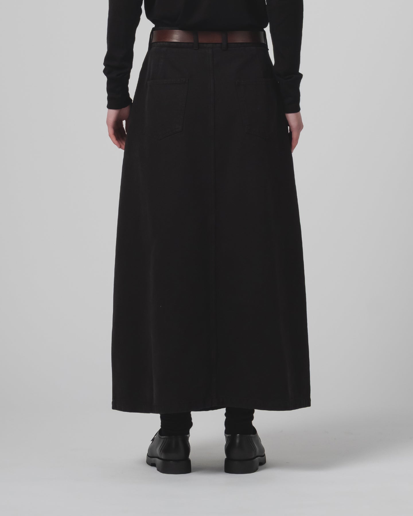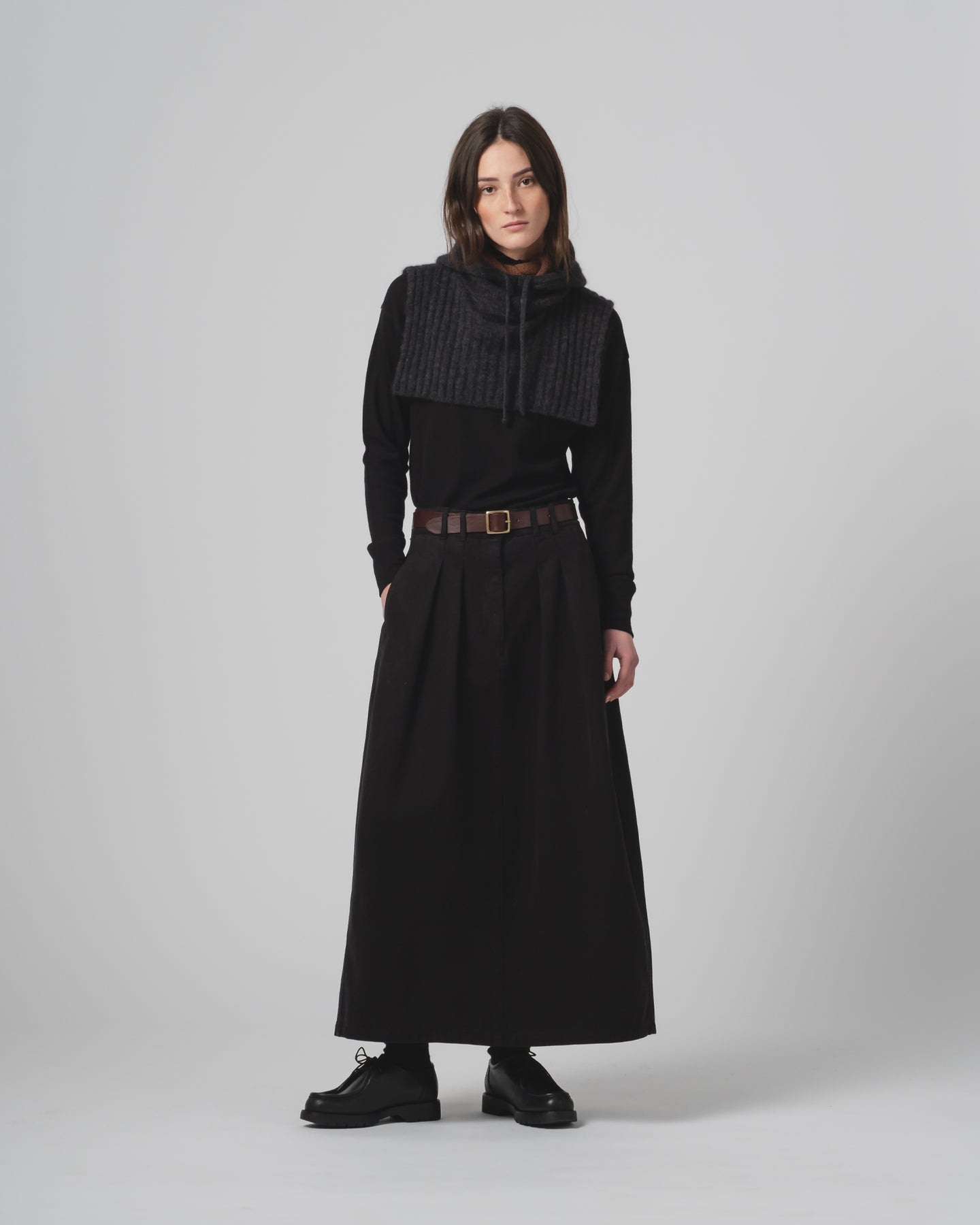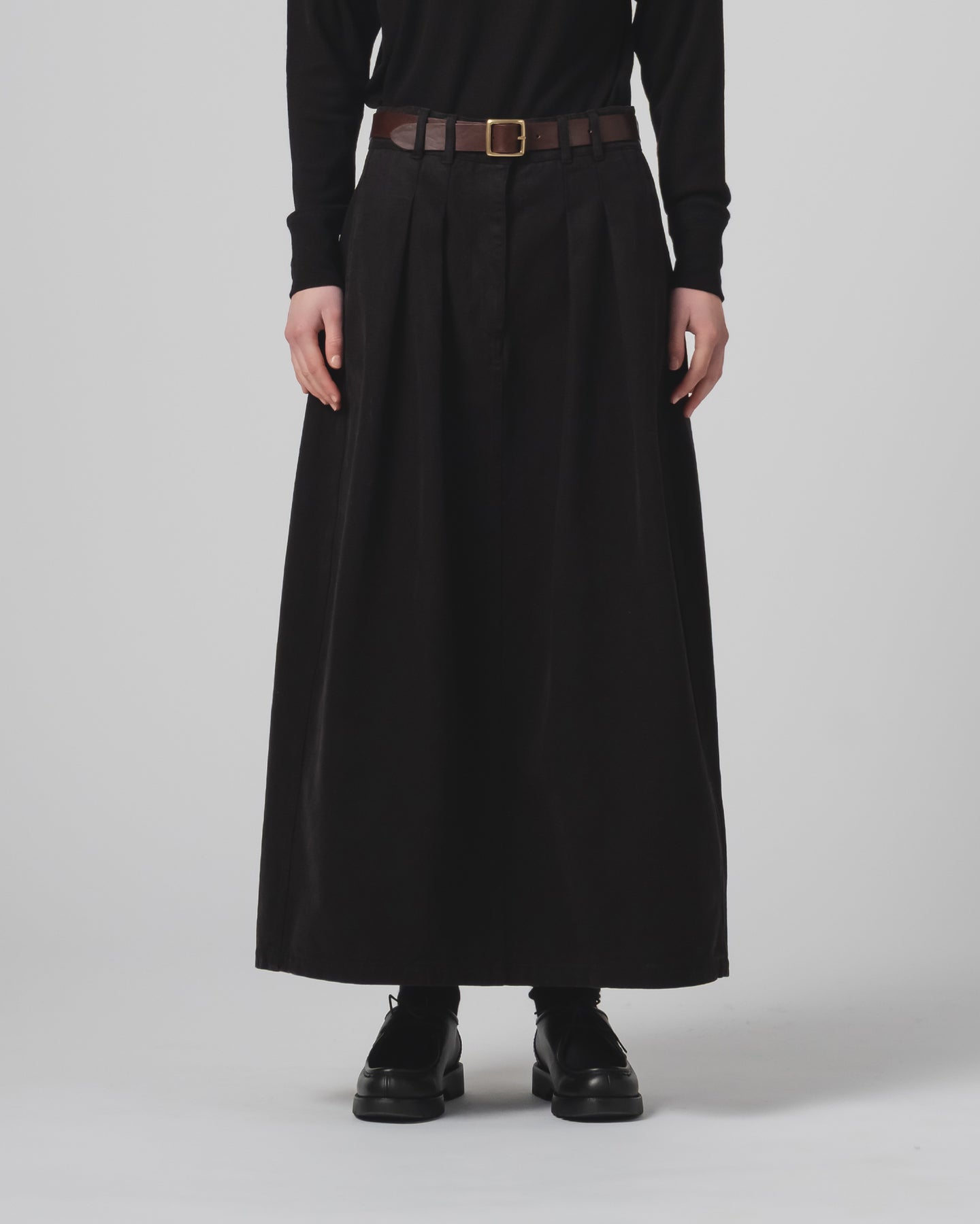 当社のMeadow Skirtから着想を得たこのミディスカートは、ダブルプリーツが特徴で、ややストレートなシルエットになっています。また、フロントポケット2つ、バックポケット2つ、ジッパー留めなど、実用的なディテールも充実しており、ワードローブに汎用性の高いアイテムとして活躍します。
