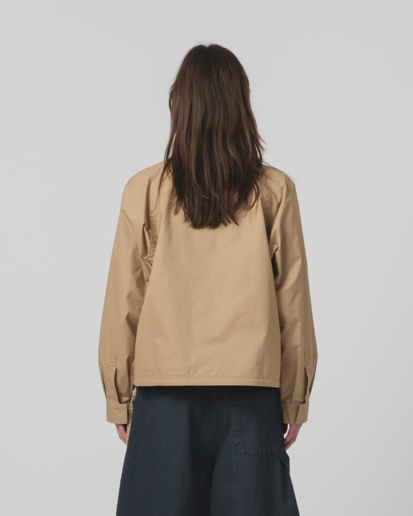 アノラックシャツは、パリッとしたポプリン生地で作られた洗練されたプルオーバータイプのシャツで、軽量ながらもハリのあるシルエットが特徴です。さりげない留め具付きのハイネックデザインが、実用的なシルエットにモダンなアクセントを加えています。ラグランスリーブとゆったりとしたフィット感で動きやすく、ウエストのドローストリングでシルエットやスタイリングを調整できます。毎日着られる、クリーンで汎用性の高い一枚です。