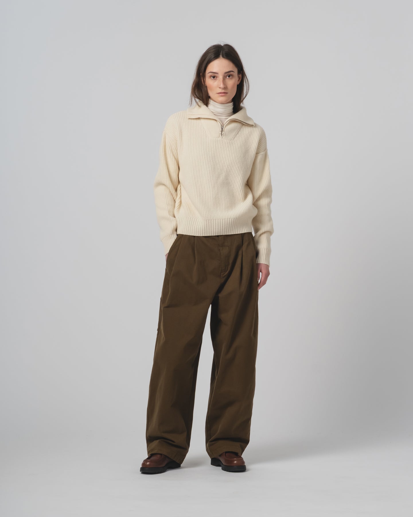 ヴィンテージミリタリーウェアからインスピレーションを得たこのフライデッキセーターは、暖かく丈夫でありながら、使用されている上質なイタリアンメリノウールのおかげで柔らかい肌触りです。ハーフジップのファンネルカラーとドロップショルダーが特徴です。