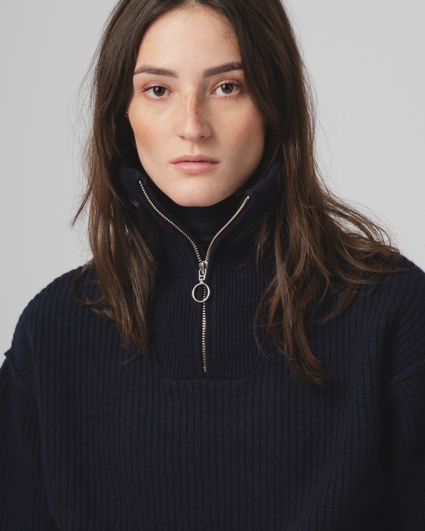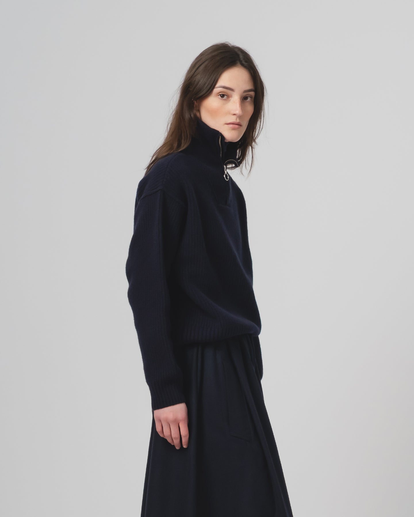 ヴィンテージミリタリーウェアからインスピレーションを得たこのフライデッキセーターは、暖かく丈夫でありながら、使用されている上質なイタリアンメリノウールのおかげで柔らかい肌触りです。ハーフジップのフンネルネックとドロップショルダーが特徴です。