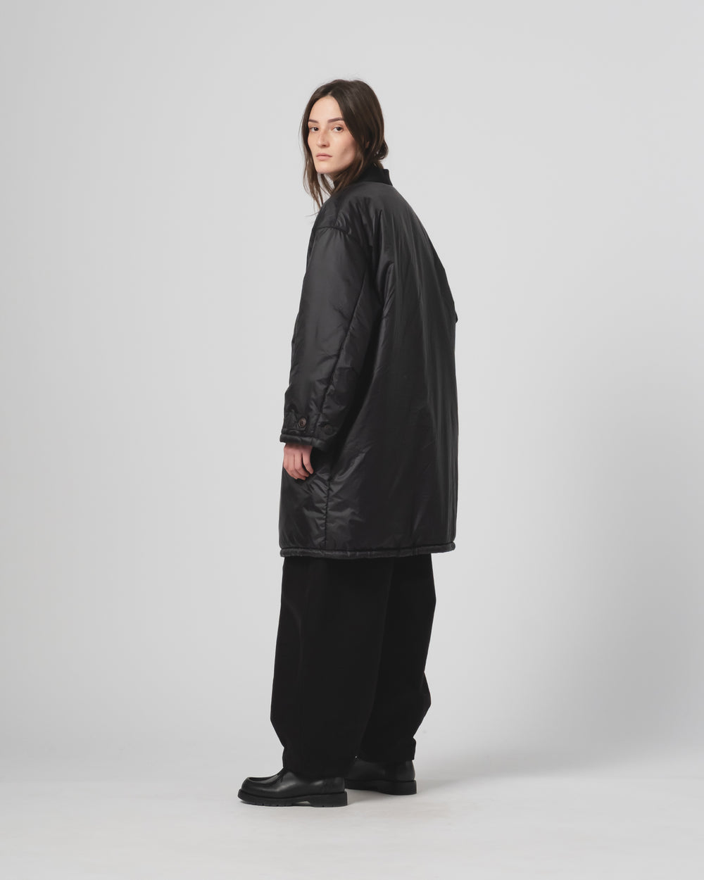 ライナーとしてではなく、コートとして着られるアイテムです。ヴィンテージのアメリカ軍スタイルをベースにしたこのアトムライナーは、ゆったりとしたシルエットで非常に快適です。ドロップショルダーと膝丈のデザインで、暖かく包み込まれるような着心地です。高品質のイタリア製ポリアミド生地を使用。2つの大きなフロントポケット、リブトリムの襟、調節可能な袖口が特徴です。