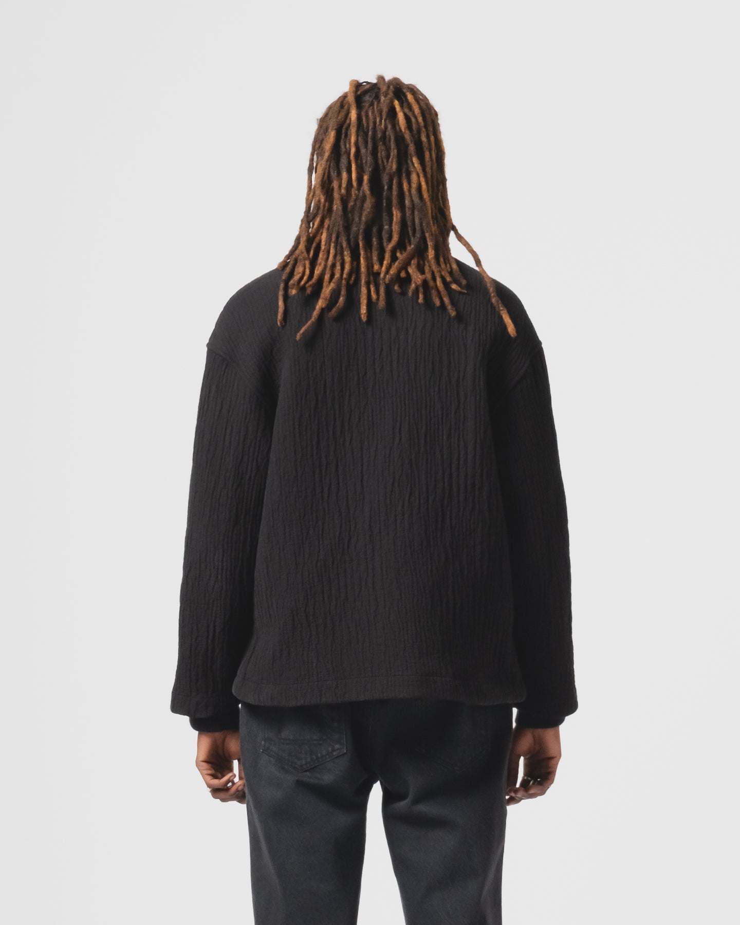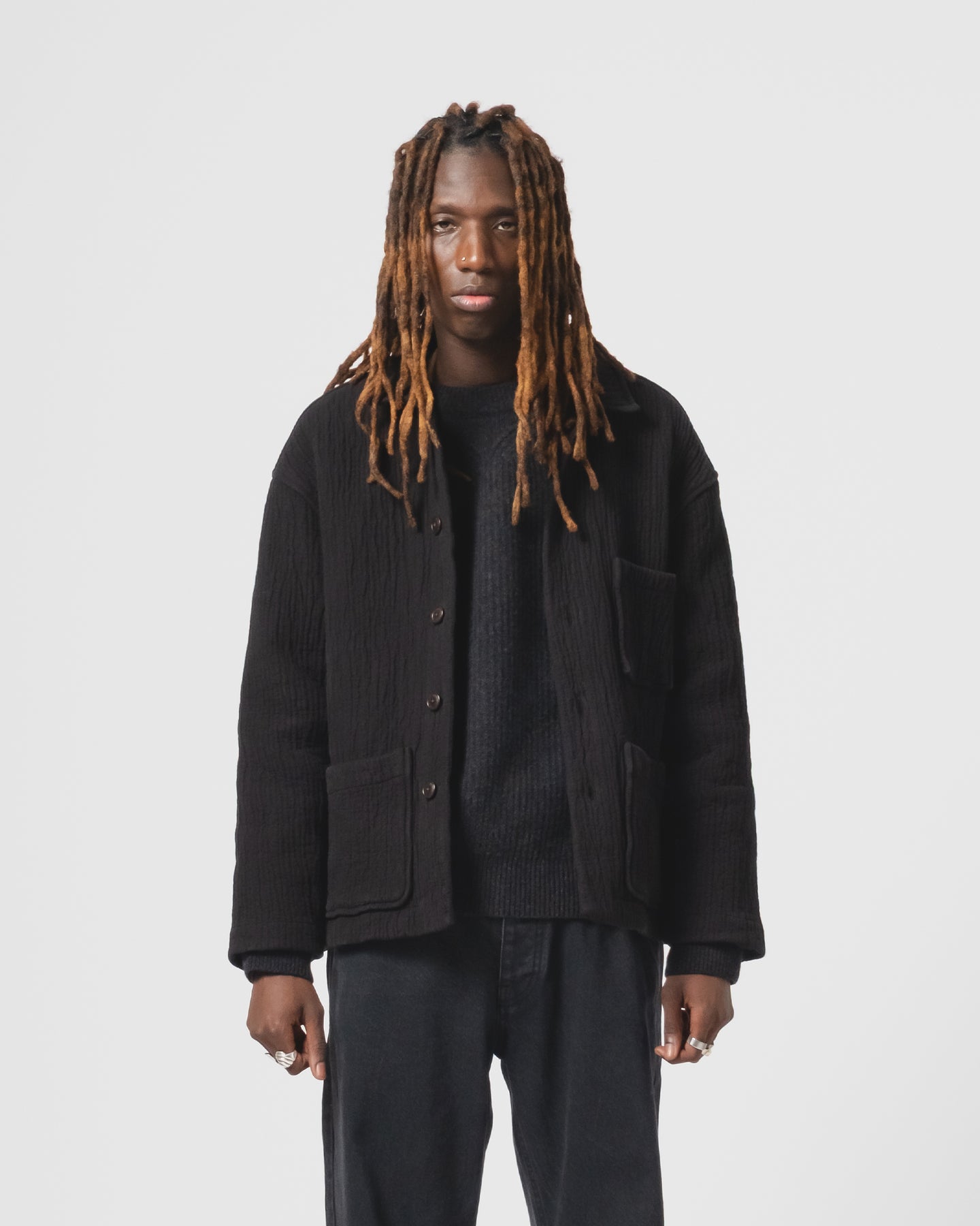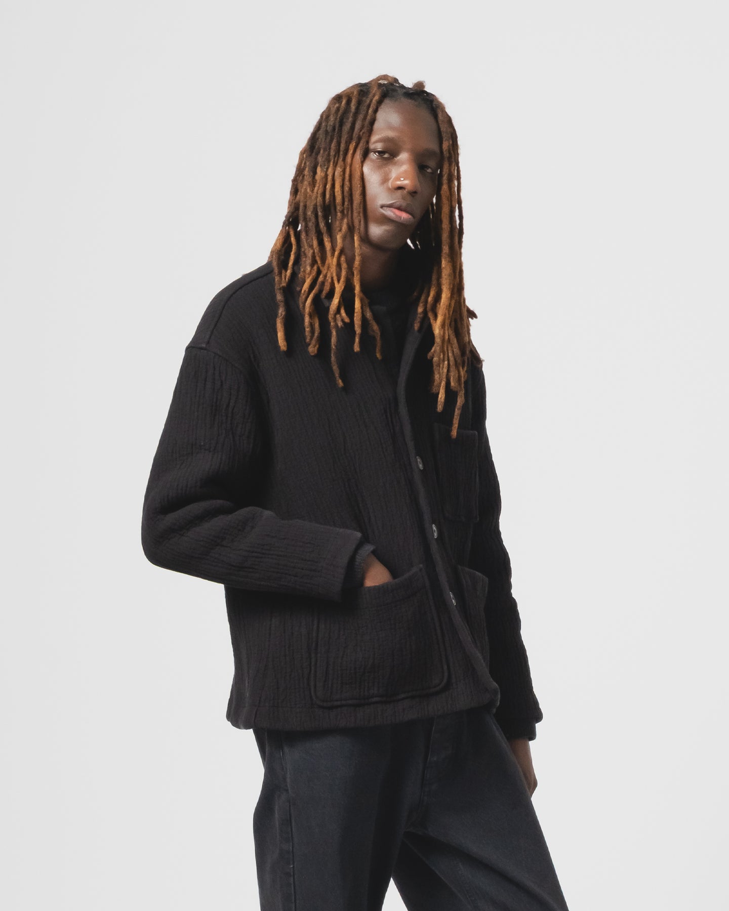 新作のカナシャツは、暖かさと質感に富んだジャカード織りの厚手のコットンで作られたオーバーシャツです。ゆったりとしたフィット感で、ヒップポケットとクラシックなボタン留めが特徴です。丈夫な生地とシャープなシルエットで、この冬の寒い日に最適なレイヤリングアイテムです。