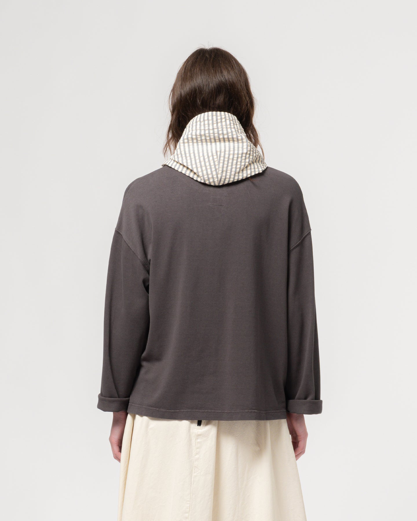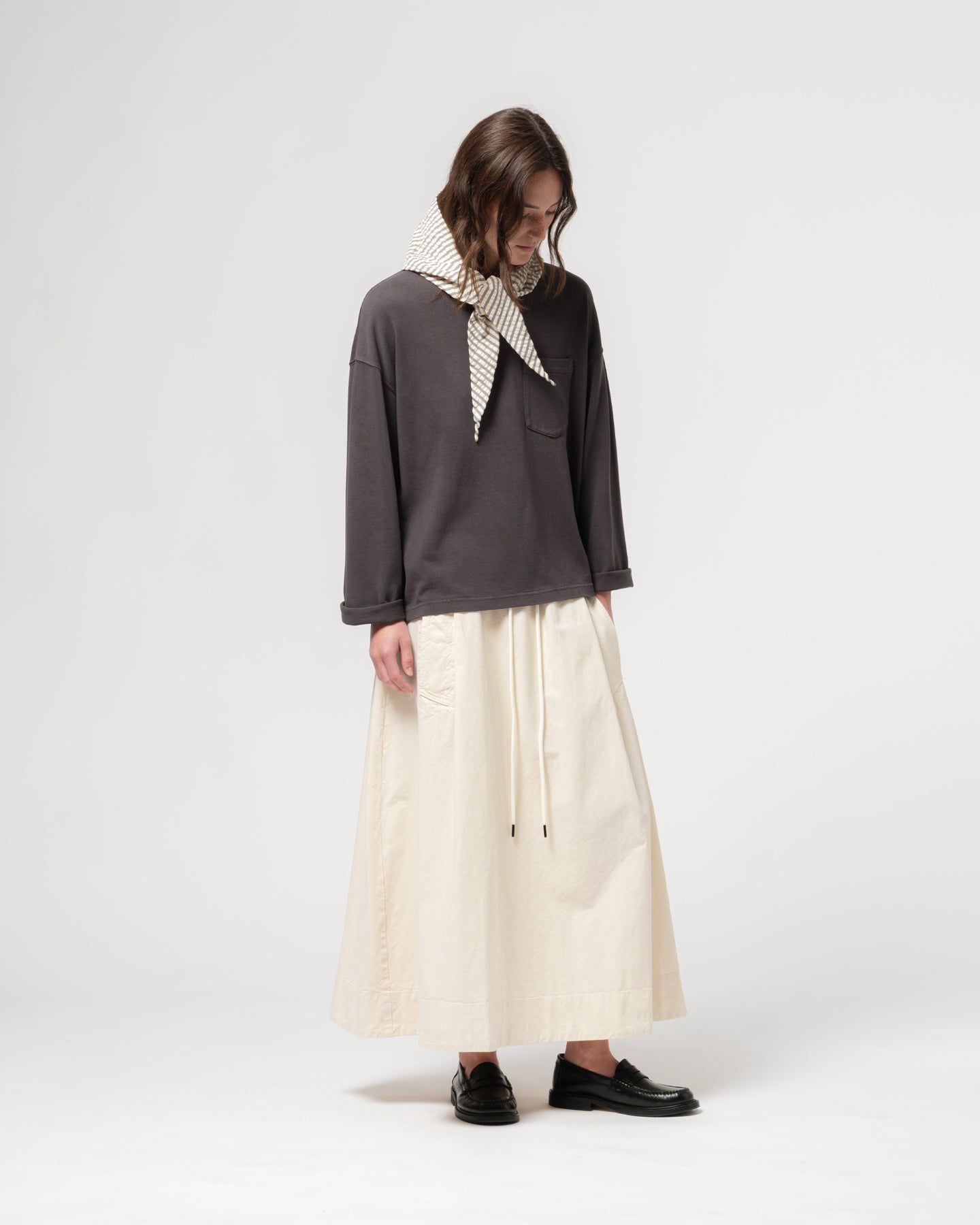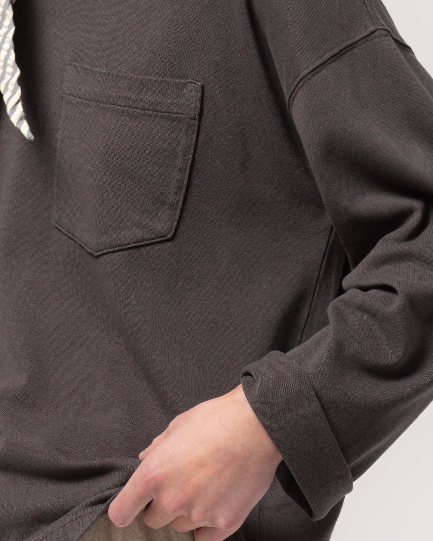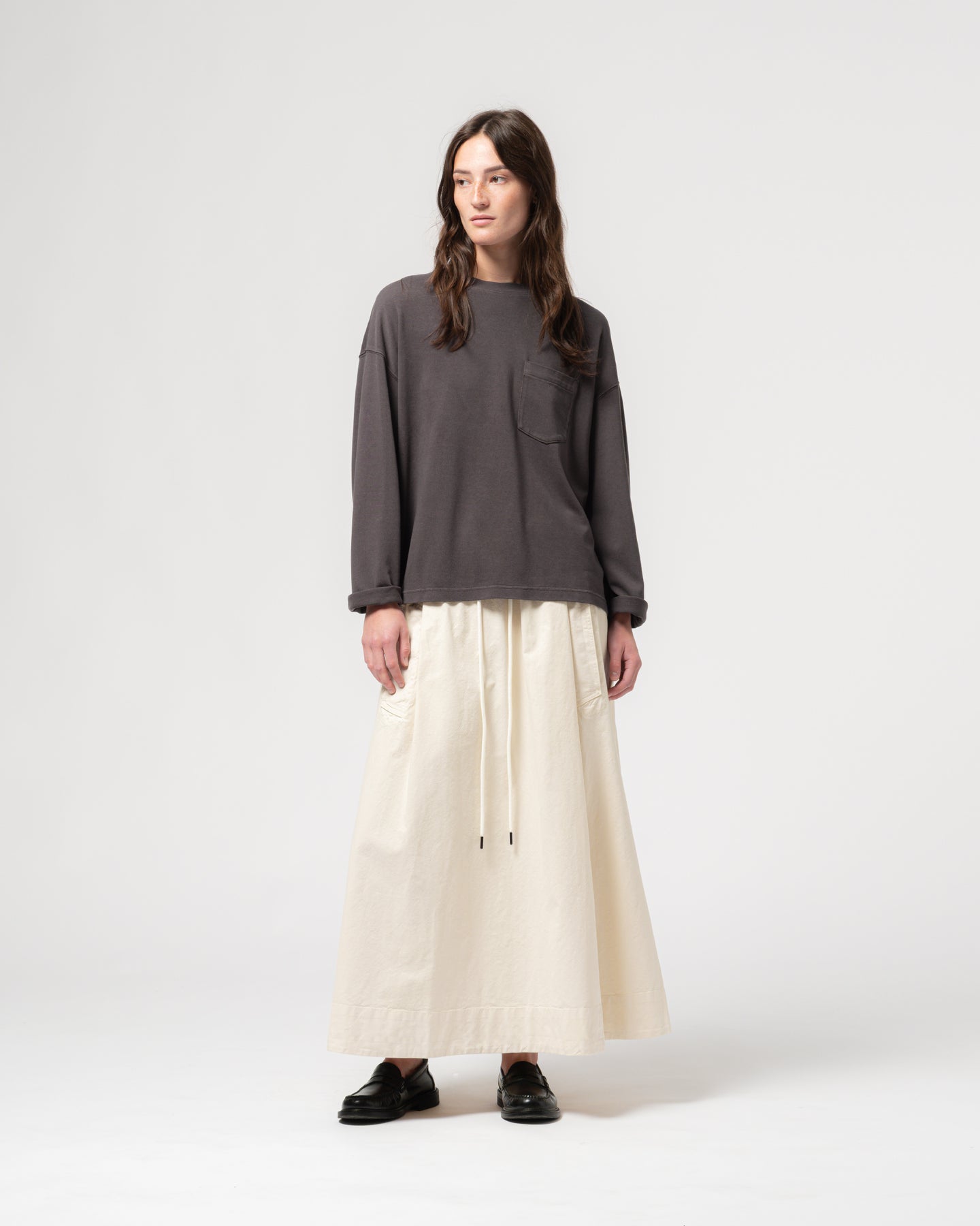 クラシックなライトニングTシャツのロングスリーブバージョン。ゆったりとしたボックスカットと実用的な胸ポケットが特徴です。リラックスフィットで、季節を問わず重ね着に最適。カジュアルなデニムにも、洗練されたテーラードアイテムにも合わせやすい一枚です。汎用性を重視したデザインです。