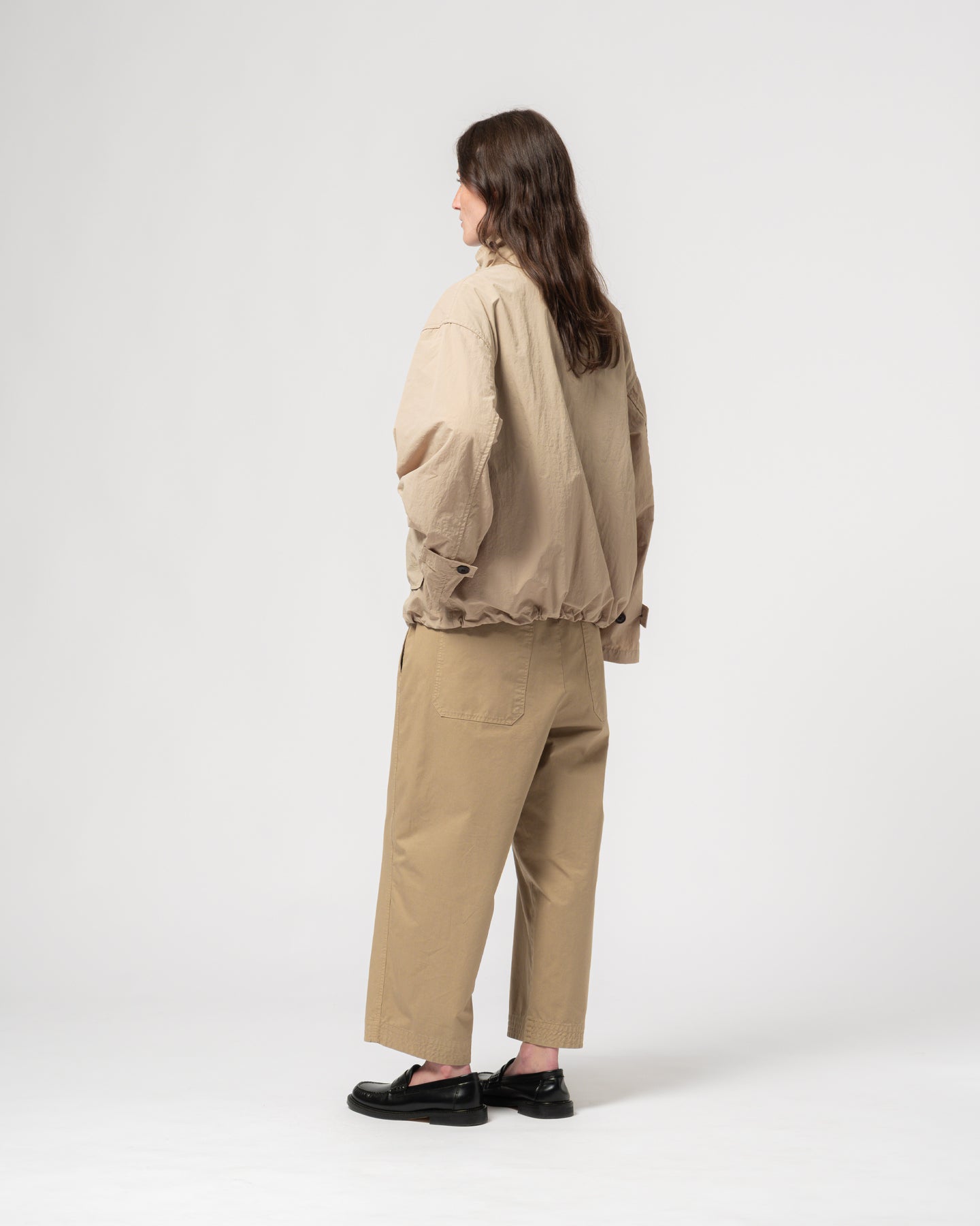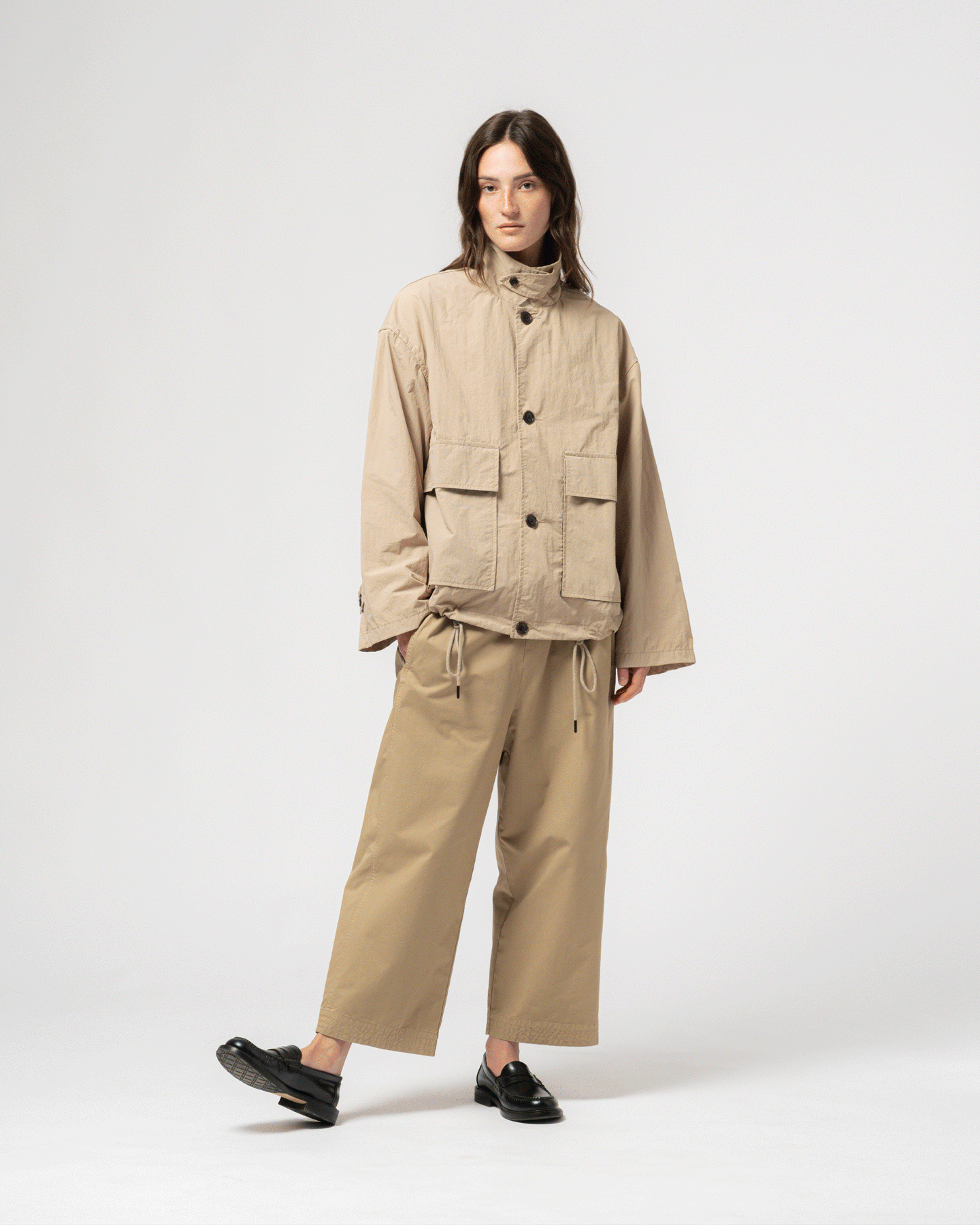 This new unisex windbreaker delivers effortless style with its boxy silhouette. Made from Fuji nylon, it features two spacious pockets, corozo button closure  and adjustable sleeves paired with a drawcord waist for a customizable fit.