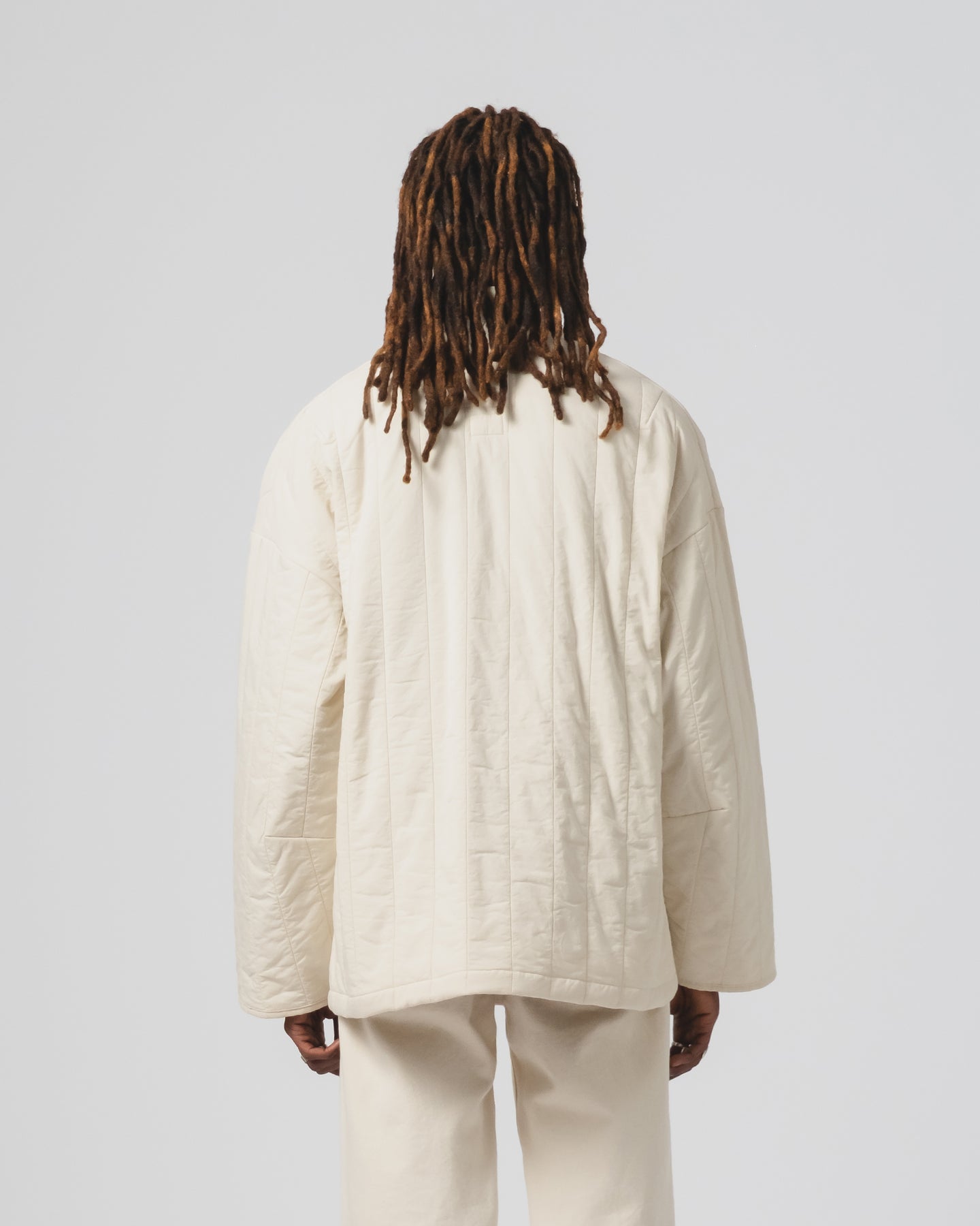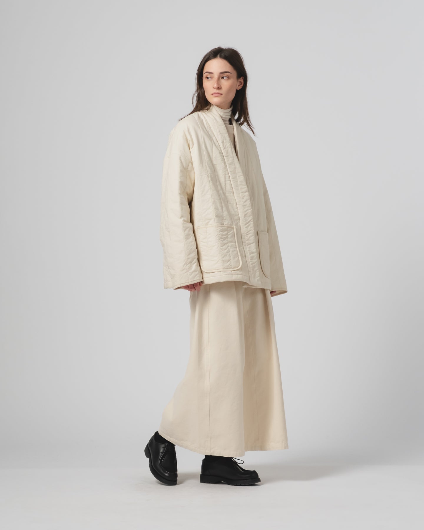 Take a Kimono, make it longer and make into a jacket. This is our Edo jacket. Made from a padded cotton for extra warmth, making it a great choice as an easy extra layer you can throw over your shoulders when needed.