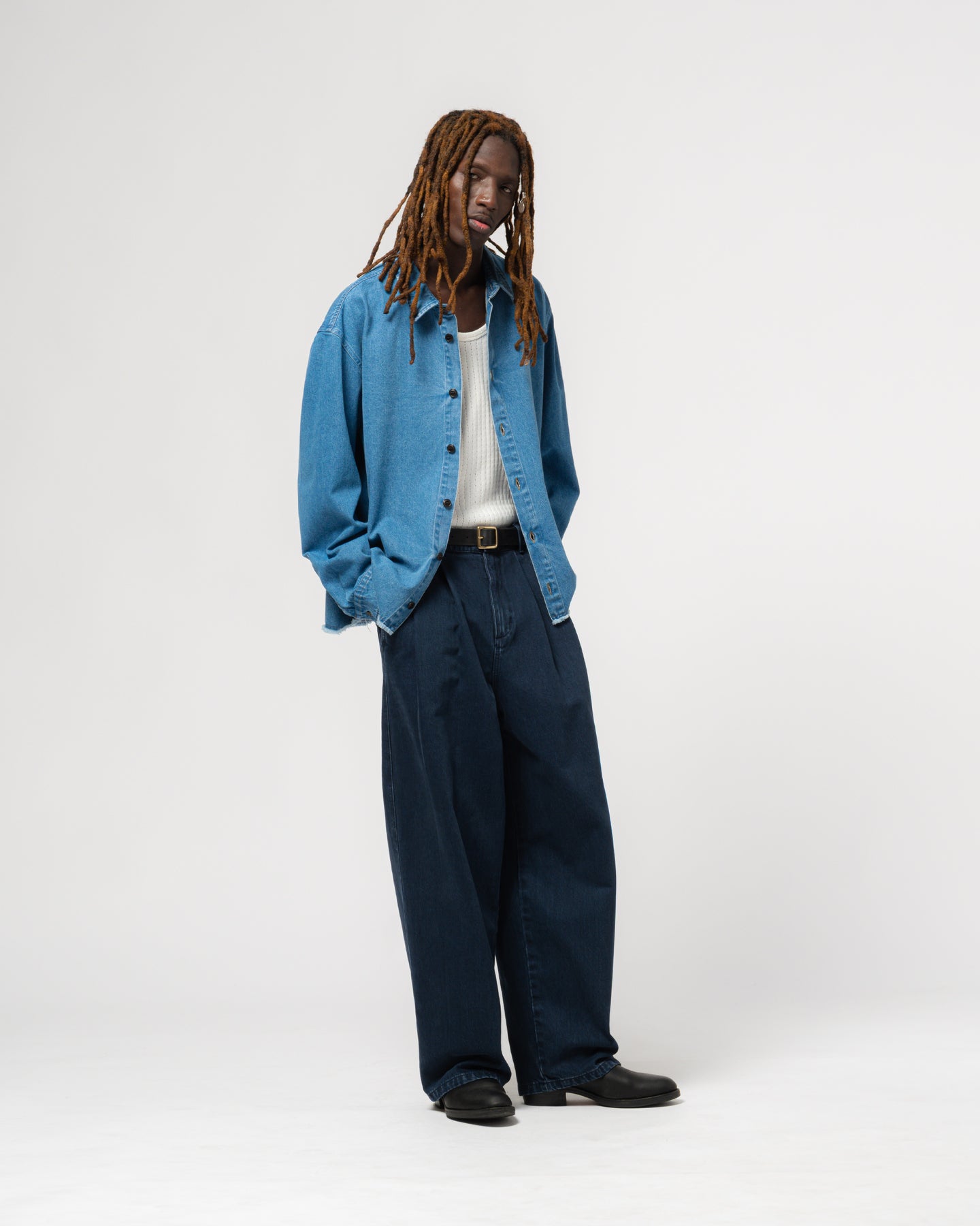 The Consul pant is a wide, straight-legged denim pant with pleats, creating a flattering silhouette that drapes effortlessly. Made from sturdy denim, these trousers will stay in your wardrobe rotation for multiple seasons. These pants pair perfectly with our Temple jacket, but any other top will make them stand out.