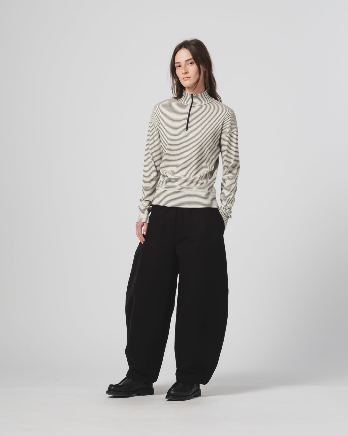 Now, for something completely different, we're excited about this zipper pull-over! Made in Portugal from a fresh wool blend, this little pullover sweatshirt fits loose on the body (with dropped shoulders as well), but tighter on the arms, plus it's finished with a cool half-zip funnel collar. The ideal extra layer under whatever you want, or just wear it out on its own.